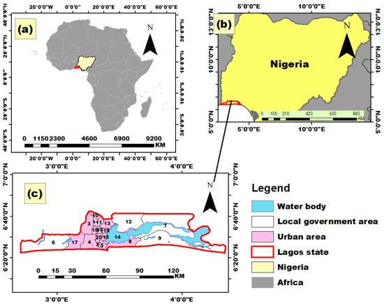 Lagos lies in the coastal lowlands of southwest Nigeria, specifically between latitudes 6°22′–6°42′ N and longitudes 2°42′–4°20′ E, respectively (Figure 1) [22]. The Republic of Benin bounds Lagos State on its western side, while the Nigerian state of Ogun bounds it on its northern and eastern sides. While the Atlantic Ocean borders it on its southern side. Lagos, with 9,113,605 inhabitants in 2006, is Nigeria’s most populous state, accounting for roughly 6.44% of the country’s total population. It also has the continent’s most populated city, with 12 million [20]. Furthermore, among the 28 present and future megacities, Lagos was ranked ninth in a recent United Nations study on World Urbanization Prospects [11].