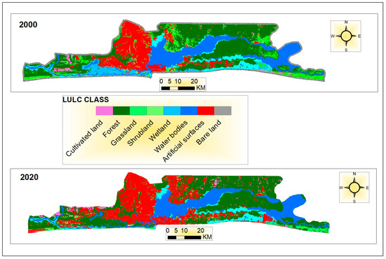 Table 2 and Figure 7 illustrate the dynamics of LULC from 2000 to 2020, presenting changes in proportions across various LULC classes over the two-decade period. The expansion of cultivated areas is evident, increasing significantly from 46.771 km2 (1.238%) in 2000 to 75.283 km2 (1.993%) in 2020, indicating shifts in agricultural practices. Forest cover has experienced a modest increase, from 1,485.171 km2 (39.319%) to 1,627.301 km2 (43.081%), suggesting a relatively stable condition. In contrast, grasslands have seen a substantial decline, decreasing from 296.083 km2 (7.839%) to 70.812 km2 (1.875%), likely attributed to urbanization growth. Shrubland areas have also notably diminished, going from 166.991 km2 (4.421%) to 99.728 km2 (2.640%), indicating alterations in land management or natural processes. Wetland areas have contracted, reducing from 369.722 km2 (9.788%) in 2000 to 213.251 km2 (5.646%) in 2020, potentially influenced by changing natural conditions or human activity. Bodies of water have remained relatively stable, experiencing a slight decrease from 744.204 km2 (19.702%) to 738.622 km2 (19.554%). The most prominent change is observed in artificial surfaces, surging from 642.749 km2 (17.016%) in 2000 to 952.178 km2 (25.208%) in 2020, attributed to urbanization and infrastructural development. Lastly, bare land has significantly reduced, from 25.586 km2 (0.677%) to 0.102 km2 (0.003%).