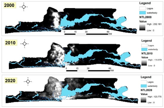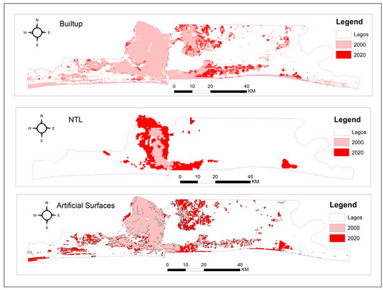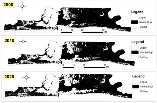 The analysis of Lagos City’s urban expansion also involved the examination of built-up data in Figure 4, along with the utilization of various indices (NDBI, NDVI, BUI). Various image features, spanning from 2000 to 2020, were extracted from Landsat TM multi-temporal satellite data accessible on the website (https://earthexplorer.usgs.gov/ (accessed on 1 June 2023)), and applied to map and oversee the expansion of urban areas in Lagos city (Table 1). This study discriminates between non-urban and urban built-up regions using the Building Density Index (BUI) and the Nighttime Brightness Index (NBI). Non-urban vegetation encompasses parks, gardens, open spaces, water bodies, and agricultural vegetation. The urban areas were categorized into closely and scattered urban zones. NDVI, NDBI, and BUI images were generated by employing the following formulas [19]:
