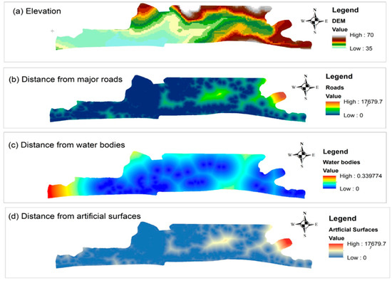 Geometric correction involved rectifying geometric distortions in the collected satellite images to enhance spatial representation accuracy. Simultaneously, radiometric calibration standardized pixel radiometric measurements, enabling meaningful quantitative analysis. Various variables (Figure 5) are considered in predicting future land-use changes, encompassing two types: static variables like height (m), slope (degree), and proximity to water bodies (m), and changeable variables, including proximity from major roadways and existing artificial surfaces in (m). It is essential to highlight that dynamic variables can be adjusted and recalculated throughout the prediction process, whereas static variables remain constant over time [25,26]. This study’s sub-modeling concentrated on two primary variables: crucial LULC transitions and the propelling forces behind them. Figure 4 presents the standardized variables employed in the current investigation.