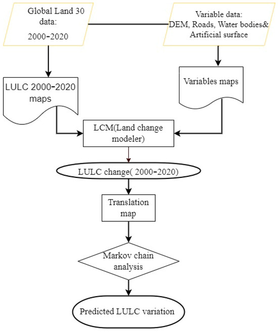 The CA-Markov model is a prevalent tool within various LULC modeling methodologies, encompassing spatial and temporal alterations [38,39,40]. This model amalgamates cellular automata and Markov chain techniques, enabling the projection of LULC changes and their respective characteristics over time [41]. Its utility extends to aiding planning processes by supporting the analysis of temporal shifts and spatial distribution patterns within LULC [42]. Its significance extends to land-use policy formulation and planning strategies for sustainable land utilization [42]. Its significance further extends to the realm of land-use policy formulation and planning strategies directed towards sustainable land utilization [42]. Investigating historical LULC changes becomes essential, enabling a comprehensive comprehension of the interplay between human activities and the environment from a long-term standpoint [43].