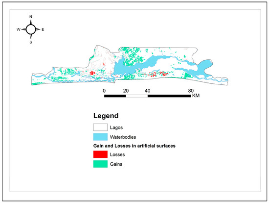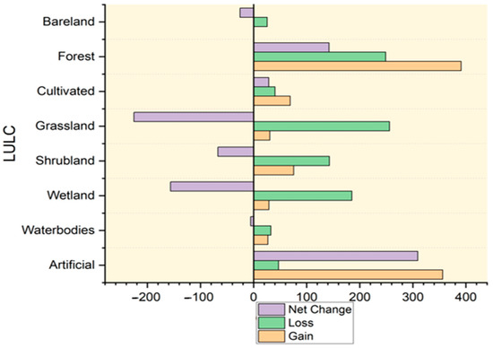 Table 3 and Figure 9 provide a comprehensive breakdown of changes in LULC categories, encompassing gains, losses, net changes, and percentage changes. Notably, the category of artificial surfaces exhibited substantial growth, primarily attributed to urbanization and infrastructure development, with a significant net increase of 309.429 km2 or 8.19%. Conversely, the waterbody category experienced both losses and gains, resulting in a modest decline of −5.582 km2 or −0.08%, potentially influenced by various factors affecting water features. Wetland areas underwent the most significant net change, encountering a loss of 156.471 km2 or −2.39%, likely due to conversions to alternative land uses. Both shrubland and grassland recorded substantial losses, with net decreases of −67.263 km2 (−1.03%) and −225.271 km2 (−3.48%), respectively, potentially associated with alterations in land management or human activities. Cultivated land witnessed an increase of 28.512 km2 or 0.43%, possibly resulting from conversions from other land categories. Forest exhibited gains and a net change of 142.13 km2 or 2.32%, likely influenced by reforestation initiatives. Bare land experienced a notable decrease, with a net loss of −25.484 km2 or −0.38%, indicating changes in land use. These dynamics are spatially illustrated in Figure 9 and Figure 10, offering valuable insights into the evolving landscape over the study period from 2000 to 2010.