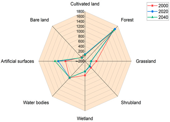 Drawing upon the outcomes of this investigation, notable trends in LULC alterations manifest across three distinct time spans (2000, 2020, and 2040) within the realm of urban sprawl prognosis. Specifically, the proportion of artificial surfaces has markedly risen from 17.016% in 2000 to 28.967% in 2040 (Figure 14), indicative of the expansion of urban areas—a clear signal of urban sprawl. Although there is a marginal decrease in forested areas, possibly attributed to some conversion for urban expansion, cultivated land exhibits fluctuations, possibly influenced by shifts in agricultural practices or land-use regulations. Waterbodies generally remain stable, yet grassland, shrubland, and wetland areas exhibit negligible fluctuations, suggesting a certain resilience to urban growth in this region. The percentages of bare land continue to remain at low levels.