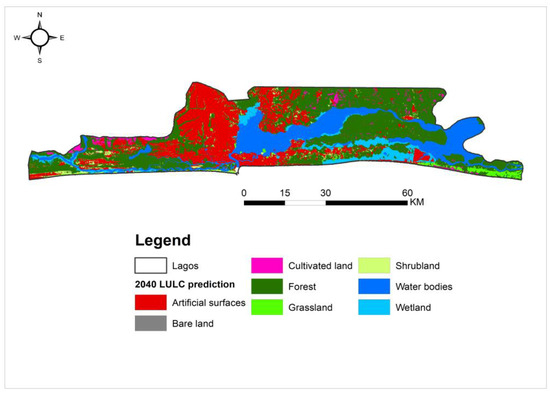 The projection of LULC for 2040 (Figure 11) illustrates substantial shifts in the distribution of land-cover categories compared to data from 2000 and 2020. Notably, the trends in artificial surfaces, or urban areas, and forests hold particular significance. In 2000, urban areas encompassed 642,749 km2, constituting 17.016% of the total land area. By 2020, this figure had markedly increased to 952,178 km2, representing 25.208% of the total land area. The most noteworthy transformation is anticipated in 2040, with urban areas projected to cover 1,094,151 km2, accounting for nearly 28.967% of the total land area. This pattern underscores a consistent and substantial rise in urbanization (Figure 10). Meanwhile, forests, covering 1,485,171 km2 (39.319%) in 2000, are expected to occupy 1,627,301 km2 (43.081%) by 2020. In 2040, forests are projected to cover 1,551,632 km2 (41.078%) of the land area. Despite this slight decrease, forests remain a crucial component of the landscape. Overall, the statistics highlight a significant trend toward increasing urbanization (artificial surfaces), emphasizing the imperative need for sustainable land-use planning and conservation initiatives to balance urban growth with the preservation of natural ecosystems.