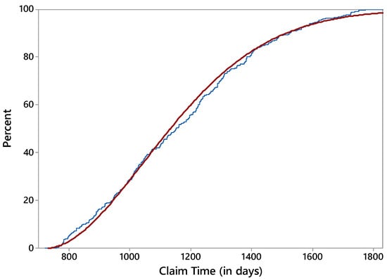 Weibull is generally assumed as the underlying failure distribution for cases where aging effects are present, especially in the reliability modeling of hardware. Its flexibility in modeling the changing behavior of failure mechanisms is also quite high. The service data were fitted to a Weibull distribution both graphically (Figure 1) and statistically. Goodness-of-fit analysis through chi-squared and Anderson–Darling tests was conducted, with the latter giving a p-value of 0.208. The graphical fit and statistical significance evidence supported the Weibull fit of the data. Next, maximum likelihood (ML) estimation of the Weibull parameters was carried out. These parameters were estimated as follows: shape parameter— = 1.635 and scale parameter— = 976.5 days. Note that this is actually a 3-parameter Weibull distribution with a threshold value of 730 days, since the claim data only started 2 years of original warranty (used in the shifted form).
