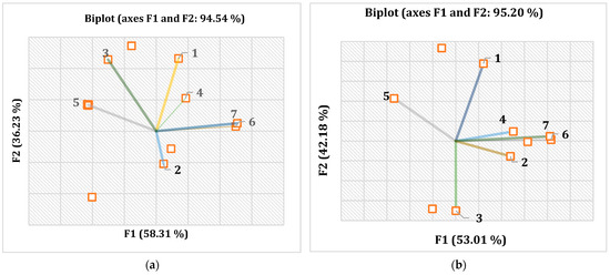 The treatments, in the absence of fertilization, are positively correlated with the majority of environmental factors (temperature—1, relative air humidity—2, and precipitations—4), with an infection level corresponding to conventional (6) and herbal extracts (7) treatments. It is noted that, also in the absence of fertilization, climatic factors are correlated with each other except relative air humidity (2) and with the levels of infection corresponding to both lack and administration of treatments (Figure 1a). When NPK soil fertilization is administered, the treatment is responsible for 58.31% of the variance, and the climatic regime for 36.23% of it. The treatments are positively correlated with the levels of infection corresponding to conventional (6) and herbal extracts (7) treatments, temperature (1), relative air humidity (3), and wind velocity. The levels of infection corresponding to conventional (6) and herbal extracts treatments (7), temperature (1), wind velocity (3), and precipitations (3) are positively correlated with climatic regimen (Figure 1b).