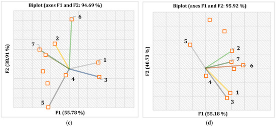 The representation in PC1 × PC2 plans of the variables corresponding to principal factors in context of the Phytophthora infestans (Mont.) de Bary attack and different agricultural inputs in cv. Ruxandra: (a) control unfertilized; (b) soil fertilization; (c) foliar fertilization; (d) mixed fertilization. 1—temperature (°C); 2—relative air humidity (%); 3—wind velocity (km/h); 4—precipitations (mm); 5—level of infection for untreated variant (%); 6—level of infection for conventionally treated variant (%); 7—level of infection for variant treated with herbal extracts.