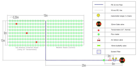 The designed area was 15 m × 9 m divided into two plots, 7.5 m × 9 m each. Both plots were equipped with a drip irrigation system where the distance between lines was 1 m and the distance between the drippers (plants) was 0.25 m. Drippers were self-compensating with a designed flow rate of 2 L/h. All 16 mm laterals feeding the drippers were equipped with small butterfly valves to ensure precise control of each dripper line, an important design feature as the irrigation schedule will be different from one plot to the next. Figure 1 shows the experimental layout.