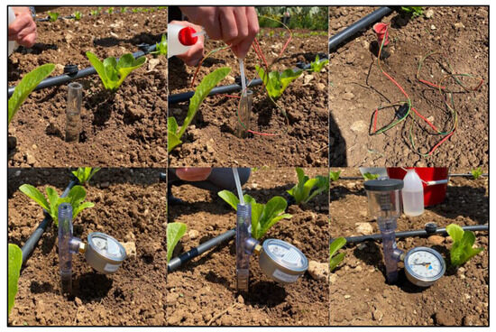 The three IoT prototypes were placed diagonally in rows no. 2, 5, and 8 at 15 cm depth (Figure 1). This depth was identified according to [57], as the ceramic cup was placed at half of the expected root zone during the season. In each measuring point, another conventional tensiometer with a mechanical manometer (JET FILL 2725) was added alongside the IoT one at the same depth (Figure 2). This was carried out to validate the developed IoT prototype and ensure its reliability.