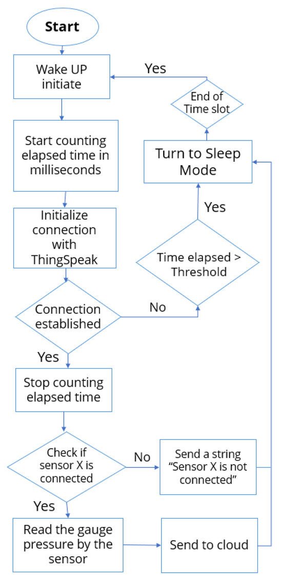 In this study, the ESP32s deep sleep functionality was exploited to conserve power and ensure the prototype’s self-sufficient operation. Figure 3 shows the algorithm flowchart. It works as follows: The ESP32 rouses itself every six hours (referred to as the “time slot” in the flowchart) to gauge the tension within the tensiometer’s vacuum via the BMP180 sensors, then it transmits three data points to the ThingSpeak cloud service and reverts back to sleep mode.