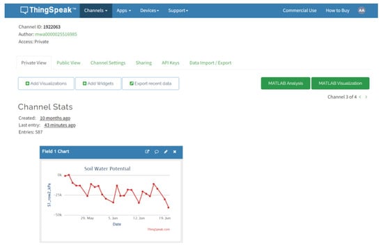 On the other hand, the second plot was irrigated on demand using the data feed from three IoT soil moisture tensiometers developed by CIHEAMs Bari digital agriculture lab [33]. They measure the soil moisture and plot it on a cloud service platform (ThingSpeak™). ThingSpeak is a cloud-based IoT analytics platform service that enables the aggregation, visualization, and analysis of real-time data streams [56]. It was integrated into the IoT prototypes to visualize the data by linking a designated channel as a client using its identification number (ID) to receive strings from the devices (IoT tensiometers) identified by their internet protocol (Ips).
