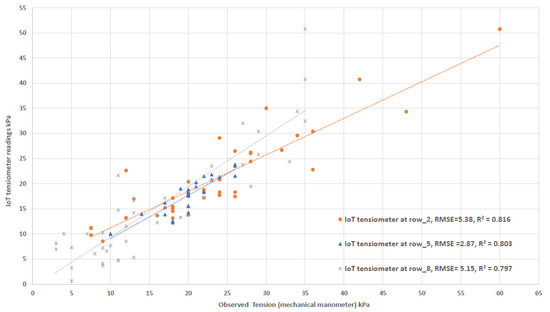 The data feed from the three IoT prototyped tensiometers was compared to the readings of the mechanical tensiometers with a daily step along the season. Figure 5 shows the format of the data received on the ThingSpeak platform on a daily basis. The tool allowed for online and continuous soil water potential visualization and tracking, was easily accessed through personal devices, and could be downloaded as a .CSV file if needed.