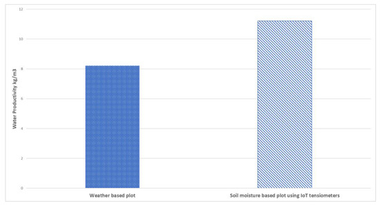 Water productivity as a result of irrigation scheduling based on weather and soil moisture using IoT tensiometers.