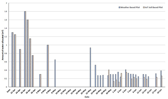 Another result worth mentioning is the frequency of irrigation events. Figure 8 shows a comparison between the applied irrigation schedules. In the initial stage, both approaches were almost the same in terms of timing and quantity. However, after the initial stage (first week), the IoT soil-based plot maintained a soil water potential between −15 and −25 kPa, reducing the number of mandated irrigation events and spacing them apart. On the other hand, the gross irrigation requirements based on the simulated evapotranspiration from the adjacent weather station necessitated more irrigation events to meet the consumptive use. Overall, the weather-based plot required 32 irrigation events with a total of 26.7 irrigation hours. While the soil-based plot required only 22 irrigation events with 21.4 irrigation hours, a 28% reduction in the amount of water allocated. Although energy consumption was not measured in this study, the irrigation time implies that potential energy savings could be achieved.