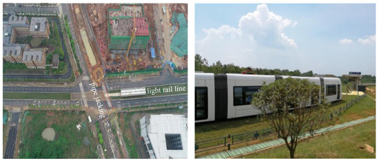 Figure 2 demonstrates the comprehensive pipe gallery passing underneath the adjacent existing light rail line, in which the pipe jacking method was adopted to build the comprehensive pipe gallery project in Wuhan city, and the buried depth of the comprehensive pipe gallery is about 5.3 m. According to geological surveying in the field, the buried strata around the comprehensive pipe gallery comprise plain soil, clay, moderately weathered mudstone and sandstone, strongly weathered mudstone and moderately weathered mudstone. The pipe jacking mainly passes through the aforementioned uniform moderately weathered mudstone layer, in which the compressive strengths of the rocks range from 28.5 MPa to 6 MPa. In terms of the hydrological situation, bedrock fissure water mainly exists in the underlying bedrock fissures, and it mainly receives lateral recharging from groundwater, in which the water volume is generally not large and has little impact on the pipe jacking process. Moreover, the ground surface water has little impact on the comprehensive pipe gallery project.