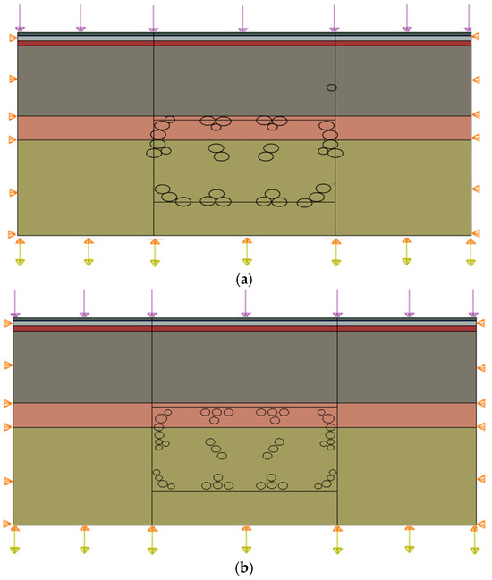 Figure 4 shows the numerical model of the pilot heading pretreatment using horizontal-directional drilling that was implemented underneath the adjacent existing light rail line, which was simulated for numerically investigating the safety of the adjacent existing light rail and the stability of the surrounding rocks. Moreover, the required threshold value of safely running the existing light rail line was less than 10 mm, and the ground surface settlement should thus be controlled, which may be influenced by variations in the distribution positions and sizes of the drilling holes when implementing horizontal-directional drilling. Therefore, two cases of horizontal-directional drilling employed as the multi-pilot heading pretreatment were studied in the numerical simulation, as shown in Figure 4, which were expected to control the ground surface settlement by adjusting the distribution position and sizes of the holes when implementing the horizontal-directional drilling technology. In cases 1 and 2, the implementations of horizontal-directional drilling had varied distribution positions and sizes of the drilling holes, in which the drilled holes had three diameters of 0.3 m, 0.4 m and 0.5 m.