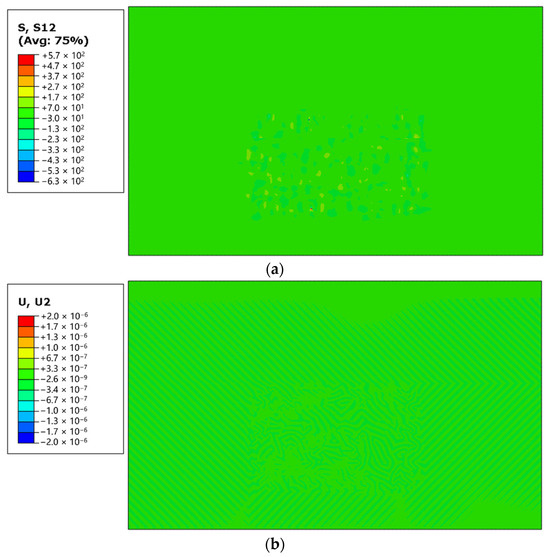 As described above, the first requirement in the numerical calculation was to balance the geostress field, in which the overall stress and strain under the balance of gravity field could serve as the initial stress state of the numerical model. Figure 5 shows the numerically obtained stress and vertical displacement of the surrounding rocks after the geostress equilibrium. It can be clearly seen that the average shear stress value in the numerical geostress field was very small, and the vertical settlement of the strata was below 0.001 mm, which meets the requirements of the geostress equilibrium in the numerical analysis.