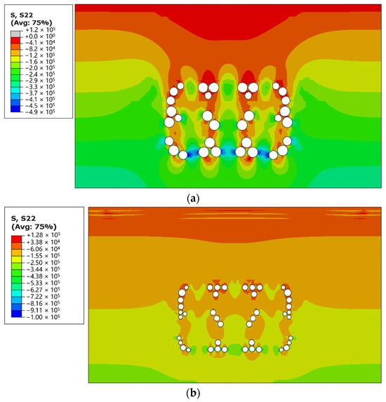 Stress redistributions of surrounding rocks (unit: Pa): (a) case 1; (b) case 2.