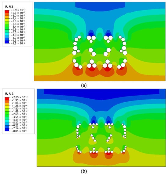Behavior of surrounding rocks after the geostress equilibrium: (a) vertical displacement of surrounding rocks (unit: m); (b) vertical displacement of surrounding rocks (unit: m).
