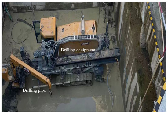 The multi-pilot heading pretreatment was implemented using horizontal-directional drilling, as shown in Figure 8, which was performed prior to operating the pipe jacking machine with a rectangular cross-section in the shallow buried rock strata. In the horizontal-directional drilling, small rotating heads were adopted in the processes of drilling the holes, which were also expected to improve the processing area by adjusting the drilling holes. Moreover, the formed holes were filled with high-density loess in a timely manner using a high-pressure pump after completing the drilling, and the hole ends were sealed with a dedicated airbag to prevent the collapse of the construction site.