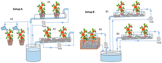 Two different setups, A and B, were utilized, with each one comprising three different systems according to the schematics presented in Figure 1: