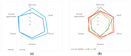 The results from the sensory analysis are presented in Figure 2 and in Table S3 (Supplementary Material). In session 1 (Figure 2a), fruit from A2 obtained the highest scores for the parameters evaluated, except for the parameter “Overall appreciation”, where the difference in A1 score is minimal and without statistical significance. In session 2, fruit from A3 attained the highest score in “Red color” and “Smell”, but the lowest in “Flavor” and “Texture”. This high score in “Red color” (4.5) is corroborated by the respective lycopene value (1.15 mg/100 g), the highest found from all the systems studied. From setup B, fruit from B1 scored the highest, although the best score for “Texture” and “Juiciness” was attained by fruit from B2.