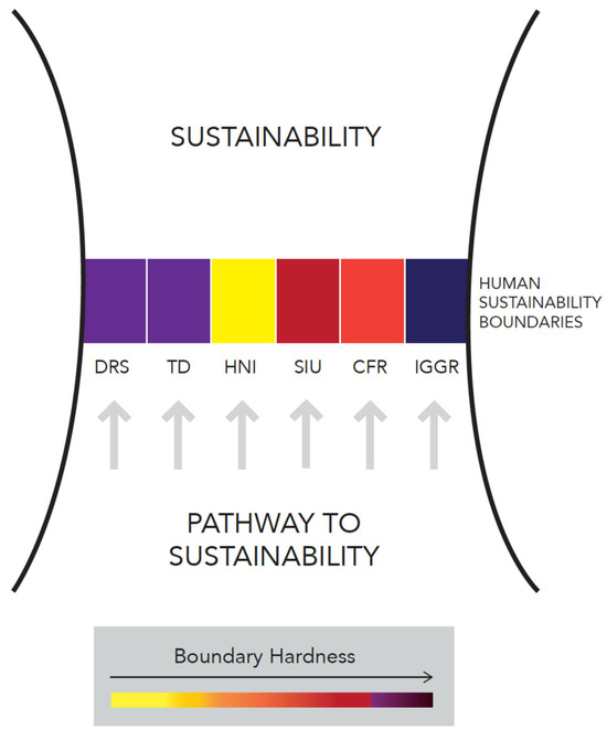 It is possible to reduce the inhibiting power of each critical determinant in narrowing the pathways of human societies toward sustainability. This is a vital process, which we term softening. Each HSB acts on the three sustainability components, and each has a certain degree of hardness when we attempt to soften their action on each component. The hardness (softness) of the HSB has a global spatial dependence that is continually evolving with time. HSB softening can be achieved through appropriate transformative pathways [29]. Incremental changes to “business as usual” are currently far from successful, so transformative human processes are necessary to safeguard humanity’s sustainable future [30]. The most promising, consensual, comprehensible, and universal current pathway is to reach the 169 UN SDG-quantified targets by 2030. This goal is unlikely to be fully achieved in time. It will probably require more robust human transformational processes.