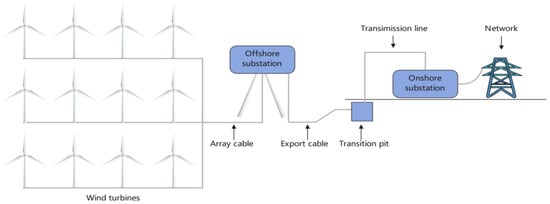 Offshore locations typically offer a more dependable and potent wind resource than onshore sites, resulting in a more consistent and reliable energy output, thereby rendering offshore wind farms notably more efficient in electricity generation when compared to their land-based counterparts [3]. Moreover, offshore wind farms hold a distinct advantage as they do not encroach upon precious terrestrial real estate, preserving the potential for the multifaceted use of coastal areas and thereby presenting ample room for expansion. Furthermore, the expanse of offshore environments facilitates the deployment of larger and more robust wind turbines, unhindered by the spatial constraints often encountered on land. This capacity for utilizing larger turbines translates to heightened energy production per unit and ultimately reduces the total number of turbines required for a given capacity, consequently yielding substantial cost savings. The overall structure of offshore wind farms is shown in Figure 1.
