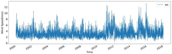 The meteorological dataset used in this study spans from 1 January 2000 to 1 July 2018, with a one-hour resolution. In total, there are 166,559 records, covering various fields such as wind direction, wind speed, temperature, global radiation, and relative humidity. This study only uses wind speed data for time series forecasting, and the unit of wind speed data is .