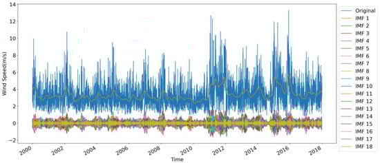 Through the stationarity test of the data, the data meet the stationarity requirements in the time series, but the data noise is too large and it is impossible to achieve a high degree of extraction of data trends and features. Therefore, VMD is applied to the data, and the daily average wind speed data are decomposed into 18 groups of component data. It is used to extract data trends and features, as shown in Figure 3.