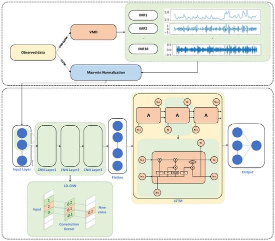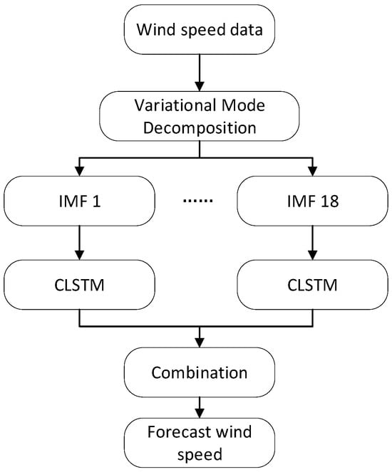 The overall structure of the VMD-CLSTM model is shown in Figure 4. The input data are decomposed into 18 groups of data components through VMD, as shown in Figure 3, respectively named , where represents the component serial number. CNN-LSTM models were constructed and trained on the 18 groups of decomposed data. By integrating the predicted output values of each group of models, the predicted value of wind speed was obtained. The predicted value is reused as the input data of the model for prediction, and repeated iterations can achieve the prediction results of wind speed data for the next 60 days for a long period.