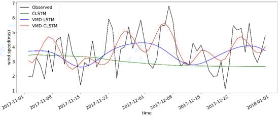 This study conducts comparative experiments using baseline models to validate the predictive superiority of the VMD-CLSTM model. The baseline models include the CLSTM model and the VMD-LSTM model. Specifically, the CLSTM model directly predicts daily average wind speed data without VMD, serving as a comparison to investigate the impact of VMD in the VMD-CLSTM model. The VMD-LSTM model exclusively employs the LSTM model for prediction without utilizing VMD on the data previously decomposed by VMD, providing a comparison to explore the role of CNN convolution in feature extraction. Through a search for model hyperparameters, the parameters employed in this study for each model are outlined in Table 3.