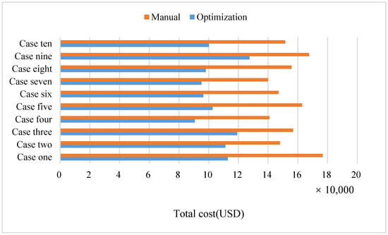 To verify the effectiveness of the proposed mixed-integer linear programming model, this section formulates a manual scheduling rule based on the actual situation in the maintenance process. Specifically, a vessel is dispatched to the offshore wind farm for wind turbine maintenance on the first day of the maintenance cycle, and a vessel is dispatched again if there are still unmaintained turbines during the maintenance process of the first vessel. The time interval of the maintenance schedule depends exactly on the maximum time interval between two adjacent PMs. In this way, the maintenance schedule is automatically scheduled through this manual scheduling rule. We considered wind forecast data for the 600 days from 11 May 2016 to 31 December 2017 and divided them into 10 cases by time interval. The length of each time interval is 60 days. The wind turbines need to be maintained at least once every 15 days. Therefore, several maintenance tasks need to be performed in a time interval. The optimal maintenance schedules for each case and their corresponding maintenance costs are obtained through the proposed model. Then, the maintenance cost of each case under the maintenance plan generated by the manual scheduling rule is calculated and the results of each case are compared with the results of the optimization model. By utilizing parameter configuration A, the results shown in Figure 7 are obtained.