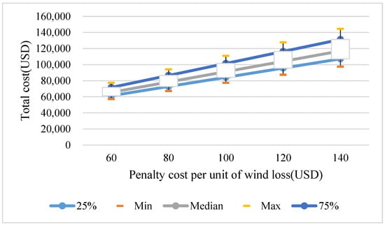 The effect of parameter on the total maintenance cost is shown in Figure 8. Increasing the penalty cost per unit of wind loss by the same amount will directly lead to an increase in the cost of wind loss during the maintenance of offshore wind farms, which in turn leads to an increase in the total maintenance cost. This is because during the PM of an offshore wind farm, the manager is responsible for the downtime losses due to the failure of the wind turbines to produce electricity during the maintenance period. The increasing penalty cost per unit of wind loss during this period will make the optimization model more inclined to schedule the optimal maintenance plan during the less windy time period to reduce the downtime loss and increase the wind turbine’s power generation efficiency. Consequently, managers must consider the influence of wind loss on maintenance costs during the formulation of maintenance programs. Simultaneously, proactive measures need implementation to mitigate penalty costs linked to wind losses, thereby lowering maintenance expenses and enhancing the economic efficiency and reliability of the system.