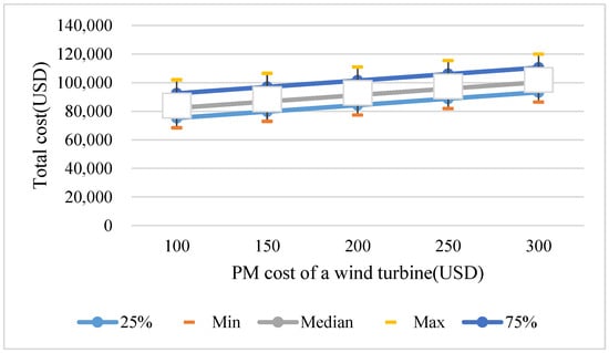 It can also be seen that the PM cost of a single wind turbine causes a more significant impact on the maintenance cost compared to the operating cost of a single service of a vessel. This is because offshore wind farms usually consist of dozens or even hundreds of wind turbines, and therefore managers need to carry out regular maintenance and servicing work on these wind turbines. These tasks include inspections, cleaning, lubrication, and replacement of parts to ensure proper operation and extend the life of the wind turbines. However, due to the large number of turbines and their wide distribution, these maintenance tasks require a large amount of human, material, and financial resources. As a result, PM costs for wind turbines account for a large proportion of the overall maintenance costs. In contrast, for maintenance vessels, managers usually only need to focus on the maintenance of individual vessels. And the operating cost of the vessel only occurs when cyclical preventive maintenance is required, so the operating cost of the vessel has a relatively small impact on the maintenance cost. Therefore, managers need to focus on the PM costs of wind turbines when developing maintenance programs and develop appropriate strategies and measures to reduce their impact. It is also important to rationally control and manage the vessel’s operating costs to ensure the economy and sustainability of the whole system.