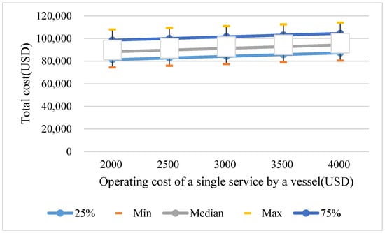 Figure 9 and Figure 10 show the effect of parameter and parameter on the total maintenance cost, respectively. The figures clearly illustrate that an increase in the PM cost for a single wind turbine corresponds to a proportional increase in the maintenance cost for all wind turbines. This is because the PM cost includes the cost of the regular inspection, repair, and replacement of parts for the wind turbine, and the increase in these costs will directly affect the rise of the total maintenance cost. The optimization model will then develop the maintenance schedule in such a way that the time interval between each maintenance for each wind turbine will be as long as possible, so that it will be close to the maximum time interval between two adjacent maintenance sessions, thus reducing the number of maintenance visits to the wind turbines. There is also the potential to reduce the operating costs of the maintenance vessel to minimize the impact of increased PM costs on the total maintenance costs. In addition, similar to PM costs, total maintenance costs are also affected to some extent when the operating cost of a vessel for a single service increases. This is because an increase in the operating cost of a vessel means that more human, material, and financial resources are required to ensure the proper operation and maintenance of the vessel. When the operating cost of the vessel increases, the optimization model will increase the time interval between two starts of the vessel as much as possible and send as few vessels as possible to complete the maintenance tasks, so as to reduce the impact of the increase in the operating cost of the vessel on the total maintenance cost. At the same time, vessels performing maintenance tasks in offshore wind farms will make full use of the resources available to the maintenance vessel and try to have all maintenance personnel working together. This may result in higher maintenance costs for the wind turbines, as some wind turbines will be maintained more than once.