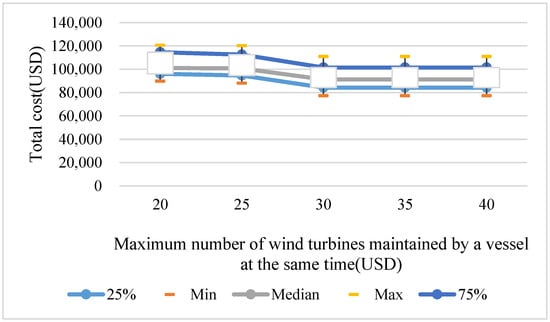 In offshore wind farms, the maximum number of wind turbines to be maintained simultaneously by one vessel has a significant impact on the manager’s development of a maintenance program as well as maintenance costs. Examining Figure 11, it is evident that when the maximum number of wind turbines to be concurrently maintained by a vessel is fewer than the total number of wind turbines in an offshore wind farm, the overall maintenance cost rises with a decrease in the maximum number of wind turbines maintained simultaneously by the vessel. This is due to the fact that in this case, the vessel needs to take on more maintenance tasks and workload. When the maintenance capacity of one vessel is not sufficient to meet the needs of the offshore wind farm, the shipyard will need to send another vessel to fulfill the maintenance tasks, which results in an increase in the operating cost of the vessel and the maintenance cost of the wind turbines. When the maximum number of wind turbines to be maintained by one vessel is greater than or equal to the number of wind turbines in the offshore wind farm, the total maintenance cost does not change. This is because in this case, a single vessel will be able to fully utilize its maintenance capacity to efficiently complete the maintenance of all wind turbines in the offshore wind farm, thus maintaining a stable level of maintenance costs. Therefore, managers need to consider a number of factors when developing a maintenance program, including the number of vessels, the number of wind turbines each vessel can maintain, and the total number of wind turbines in offshore wind farms.