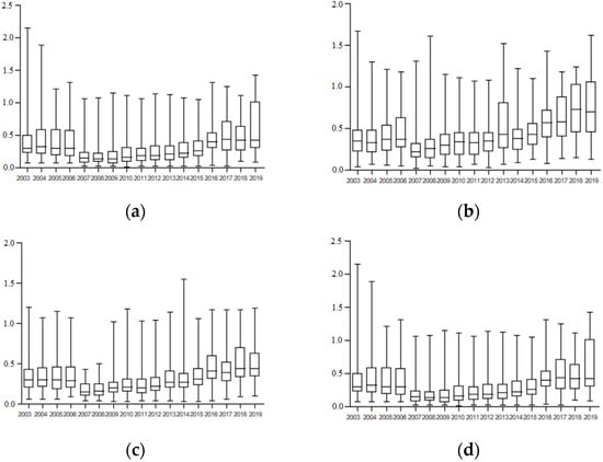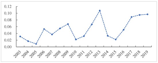 As shown in Figure 3, the temporal trend of the GIE in the three regions during the study period was basically the same, which can be concluded as follows: during 2003–2006, the level of GIE increased slowly; in 2007, there is a significant decreasing trend of GIE in all three regions; from 2008 to 2019, it depicted a rapid increasing evolution trend. To further analyze the regional disparities during the study period, we calculated the increasing rate of GIE in three regions, respectively. The average value of GIE increased from 0.432, 0.370, and 0.450 to 0.761, 0.536, and 0.567 in the Eastern, Central, and Western regions, respectively. And the average annual growth rates in the above three regions are 75.97%, 44.85%, and 25.79%, respectively. It can be concluded that green innovation in the Eastern region was continuously improving at a fast speed while those in the Central and Western regions improved slower, which agrees with the findings of Liu [].