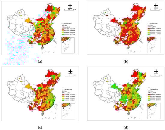 According to the estimation results, the average value of GIE in the whole of China grew from 0.416 in 2003 to 0.625 in 2019, presenting an upward trend (Figure 2). However, the mean value of GIE in China is still less than 1, indicating that there is large room for improvement. Among the three regions, Eastern cities had the highest average GIE, with a value from 0.432 to 0.761 during the research period, which is consistent with prior provincial research []. To further analyze the evolution trend of GIE, we divided the GIE into 4 classes, and then used ArcGIS to illustrate the geographical distribution of GIE in China and its three regions in 2003, 2008, 2013, and 2019 (Figure 3). It shows that the number of efficient cities increased from 35 in 2003 to 88 in 2019, indicating that many cities improved significantly in GIE during this period. Specifically, these cities mainly agglomerated in the East, implying that cities in the Eastern region, which is better allocated with improved industrial structure, financial institutions, and high-quality talent, performed better in GIE.