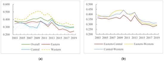 As shown in Table 2 and Figure 4b, the between-region Gini coefficients of GIE presented a declining trend. Specifically, the Gini coefficient of the Eastern–Central, Eastern–Western, and Central–Western decreased from 0.364, 0.394, and 0.381 in 2003 to 0.287, 0.295, and 0.314 in 2019, respectively. It can be concluded that the between-region difference of GIE in these three regions was diminishing, and this is consistent with the findings of Zhao []. The gap between Eastern and Western used to be the largest in 2003, and it has been narrowed significantly since 2013. However, the gap between Central and Western was the largest in 2019, which differs from the findings of Zhang [], who opined that the gap between Eastern and Western regions remained the largest during the period 2015–2018. This may be due to a diverse research scale, which focused on prefecture-level or above cities in this research instead of a specific industry. Furthermore, it may be due to technological progress in many cities agglomerated in Central provinces, i.e., Hubei, Sichuan, and Hunan; cities in the Central region have performed better in green innovation development than those in the Western region.