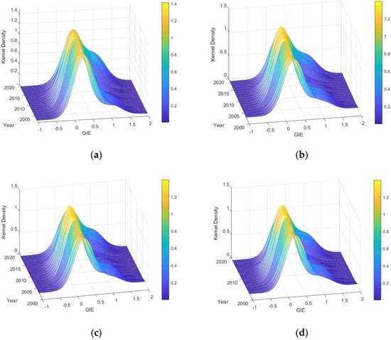 We applied the Gaussian kernel density estimation method to analyze the distribution dynamics of GIE in the 285 selected cities in China. We used the Matlab software to obtain the three-dimensional kernel density curves of GIE, as shown in Figure 5. In terms of location distribution, the position of the main peak in the whole samples and the three regions showed a slightly right-shift trend, which indicates that the GIE in these regions presented an increasing trend. Specifically, in terms of the main peak, it first moved to the left before 2006, and then to the right during 2007–2019, indicating that the increase in GIE in China mainly happened after 2007. And the trend of the main peak in the three regions is basically consistent with the whole of China, as shown in Figure 5b–d, which indicates that the increasing trend of GIE in China and the three regions is temporally similar. Meanwhile, the height of the four curves increased, presenting the increasingly spatial agglomeration characteristics of GIE. Moreover, the width of the curve narrowed, indicating that the absolute difference of GIE was diminishing.