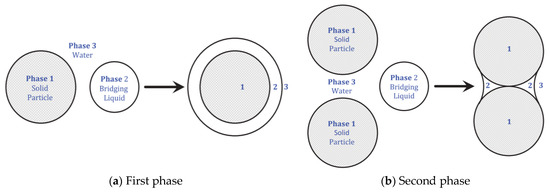 Schematic of wet agglomeration with (a) first distribution phase of wetting and bridging on the surface of material particles and (b) second distribution phase of adhering other particles.