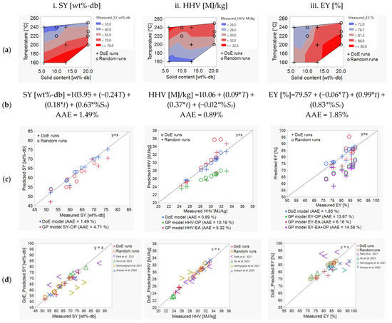 (a) Contour plots showing the dependency of the output parameters on T and So for i. SY [wt%-db], ii. HHV [MJ/kg], and iii. EY [%]; (b) equations of the DoE models; (c) comparison of measured and predicted values using the DoE models and the GP models: i. SY-OP; ii. HHV-OP; HHV-EA; iii. EY-OP; EY-EA; EY-EA+OP; (d) comparison of measured and predicted values using the DoE models from this study and the literature (see also Table S2 in SM).