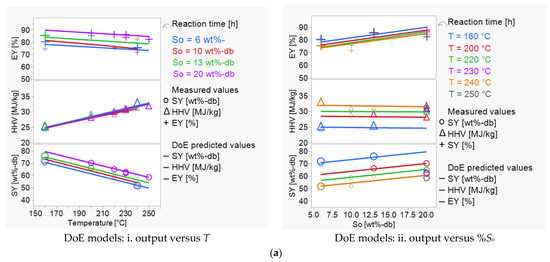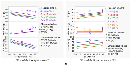 Process optimization with (a) DoE and (b) GP models using the models to predict the HTC outputs, SY, HHV, and EY from T, t, and %So shown as a function of i. temperature T [°C] and ii. solid content in reactor %So [wt%-db].