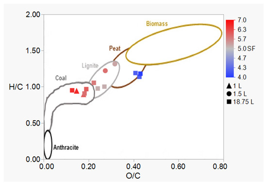 HTC treatment has a significant influence on the energetic properties of SCGs, increasing their potential for use as solid fuel. In this study, the HHV was raised from 22.5 up to 32–33 MJ/kg at the highest severity factor (SF = 6.6). These shifts in calorific values are due to changes in the ratios of H/C and O/C, which can give an indication of the composition and structures of organic compounds in hydrochars (see also Table S3 in SM). As the hydrothermal reactions proceed, oxygen-rich functional groups are split off through decarboxylation and dehydration, aromatization, and condensation polymerization, reducing the H/C and O/C ratios [21]. In Figure 4, the left shifting trend of the SCGs to the higher calorific region of more condensed materials such as lignite and anthracite coal is evident as the severity factor is increased, i.e., the HTC temperatures and residence times are increased.