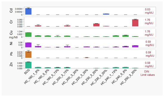 Another important parameter for the accurate estimation of air pollutant emissions when burning the fuels is the emission factors defined as the total mass of pollutant emitted per the quantity of energy consumed [58]. According to the standard DIN EN ISO 17225-8:2023, which applies to thermally treated non-woody biomass fuel, emissions of trace elements such as arsenic (As), cadmium (Cd), chromium (Cr), copper (Cu), lead (Pb), mercury (Hg), nickel (Ni), and zinc (Zn) need to be considered. These are based on the concentration of those elements and the higher heating value of the fuel, and they are reported in mg/MJ. The trace element concentrations in the solids from the DoE runs were measured, except for As and Hg, due to the lack of suitable analytical methods. As can be seen in Figure 5, the elemental emissions caused by all trace elements measured in the SCGs and hydrochars are much lower than the threshold given in the standard. There is a consistent downward trend in the elemental emissions for Cd, Cu, Ni, Pb, and Zn across the majority of hydrochars. Although the SCG values are well below the threshold values, the HTC treatment removed even more of the element, with the exception of Cr. The increase in Cr is probably due to leaching from the stainless steel reactor, and to a lesser extent Ni. This could be avoided through the use of a liner in the HTC reactor.