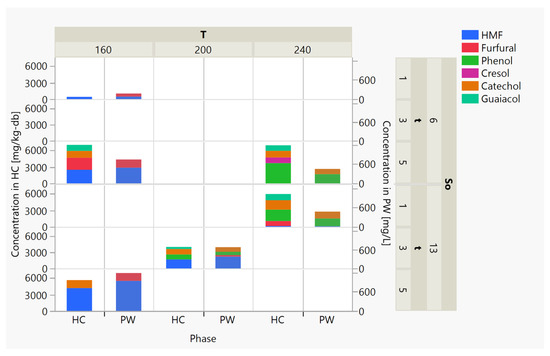 During hydrothermal carbonization, furanic and phenolic compounds were produced that remained in the process water and/or hydrochar at the end of the carbonization reactions. Furanic compounds, e.g., HMF and furfural, are produced through the dehydration of sugars, while phenolic compounds, e.g., phenol, cresol, catechol, and guaiacol, generally result from lignin degradation [60]. Figure 6 shows the concentrations of the individual aromatic compounds measured in the hydrochar and process water for the DoE runs (see also Table S5 in SM). The HMF concentration in both the hydrochar and process water was generally higher than those of furfural, except at 240 °C. Park et al. (2022) [61] also found similar behavior from the hydrothermal treatment of SCGs at 120–210 °C; more HMF was produced than furfural, reaching the maximum concentrations at 210 °C. The process temperature has a larger effect on the concentrations than the reaction time or solids content. At 160 °C, the furanic compounds dominate in both the hydrochar and process water (e.g., HC_160_5_6%, in HC: 2474.5 mg/kg-db (HMF) and 2193.2 mg/kg-db (fufural); in PW: 489.5 mg/L (HMF) and 253.6 mg/L (fufural), respectively), while at 240 °C the phenolic compounds are present at high concentrations in both phases (e.g., for HC_240_1_13%, catechol in HC: 1730.2 mg/kg-db, and in PW: 213.8 mg/L). The trends with temperature for the two groups of compounds show an inverse relationship.