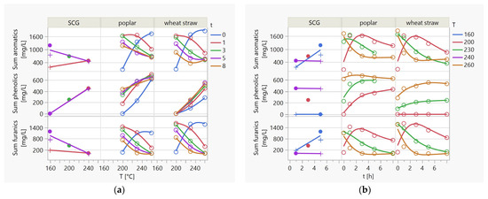 Comparison of the two groups of aromatic compounds, furanic and phenolic, measured in the process water from the HTC of SCGs (DoE runs, this study; %So = 6% +, 13% λ) with literature values from Reza et al. (2014) [30] for poplar and wheat straw (%So = 11%, ◯) as a function of (a) holding temperatures T and (b) reaction times t.