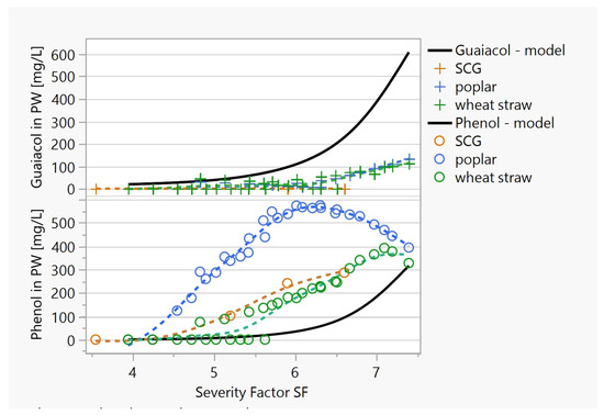 Comparison of the experimental values for guaiacol and phenol in process water from the HTC of SCGs (DoE runs, this study), poplar, and wheat straw (Reza et al., 2014) [30] to values calculated from the model developed by Borrero-Lopez et al. (2018) [67] from the HTC of lignin.