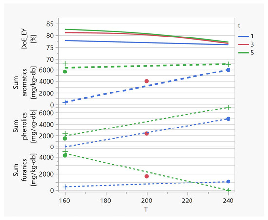 As already noted, the results from this small DoE study show that the process temperature has a larger effect on the aromatic concentrations than the reaction time or solids content. However, to gain more insight and expand these conclusions, the results are compared to those made in a much larger kinetic study on the effect of the individual process parameters on aromatic production [30]. In their study on two lignocellulosic feedstocks (poplar, wheat straw) and cellulose, sampling over reaction time (0–8 h) for three holding temperatures (200, 230, 260 °C) and constant %So (11.1%), Reza et al. (2014) [30] found non-linear trends in the production of aromatic concentrations in process water for the two lignocellulosic feedstocks, which are significantly influenced by both T and t. The comparison of the results show that more phenolic compounds were produced at the higher temperatures and initially increased with reaction times (Figure 7a,b), similar to SCGs for t ≥ 1 h. The opposite trend was found for the furanic compounds in the process water for t ≥ 1 h, except for the samples taken below 1 h. This may be due to the production of furanic compounds during the heating phase, which reacted further at high temperatures and as reaction times increased, leading to little to no furanic compounds being detected at 230–260 °C for t > 1 h. At the lower temperature (200 °C), Figure 7b shows that the production of furanic compounds requires a longer reaction time, in line with the results at 160 °C of this study. These non-linear trends are corroborated by Borrero-López at al. (2018) [67] in their extensive HTC kinetic study on the effect of reaction severity on the degradation of hemicellulose, cellulose, and lignin and the production of aromatic compounds. They found similar increases in HMF in process water from cellulose at 160 °C with reaction time, while at 240 °C with hemicellulose the high HMF concentration at t = 0 h decreased rapidly with reaction time. In contrast, phenolic concentrations from lignin increased almost exponentially with reaction severity. They proposed two groups of models from their results: kinetic models for the production HMF and furfural for each of the three biomass components and models as a function of the severity factor SF for nine individual phenolic compounds in process water from lignin (Table S6 in SM). The biomass composition was not measured in our study, so their models of two compounds, phenol and guaiacol, are compared to experimental concentrations from our study and from Reza et al. (2014) [30] in Figure 8. The experimental values are lower for guaiacol than the model values and much higher for phenol, although Berrero-López at al. (2020) [31] found good agreement for these compounds between their model and experimental values from the HTC of lignocellulosic biomass, olive stones, and beech wood over a similar range of SF. Unfortunately, it seems that additional factors other than SF must be considered to be able to predict the phenolic concentrations. Nevertheless, knowledge of these inverse trends can help in choosing process conditions depending on the goal. For example, to choose the best conditions for a high EY from SCGs, these aromatic trends can be considered along with the DoE model for EY (Figure 9). Both the EY as well as the sum of aromatic compounds was the lowest at low temperatures and reaction times. More studies are required to develop a practical reliable model for a wide range of feedstock.